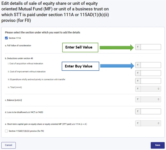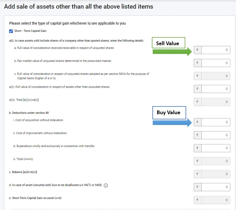 - If you selected short-term capital gain, fill in the “buy value” and “sell value” as shown in the screenshot below.