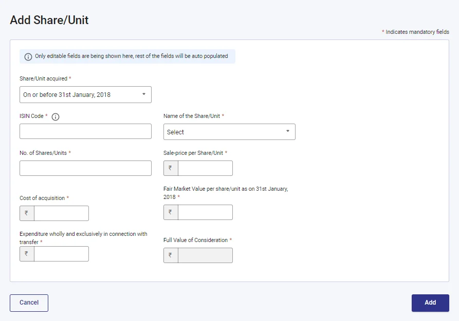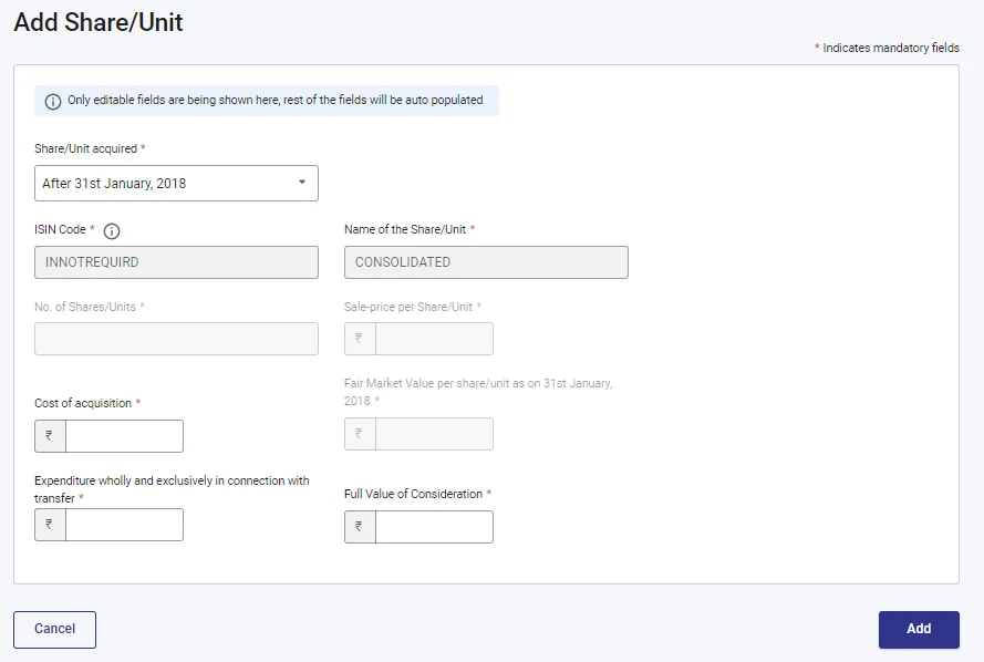If the purchase date of sale of units/shares is after 31st January 2018, then add the below details: