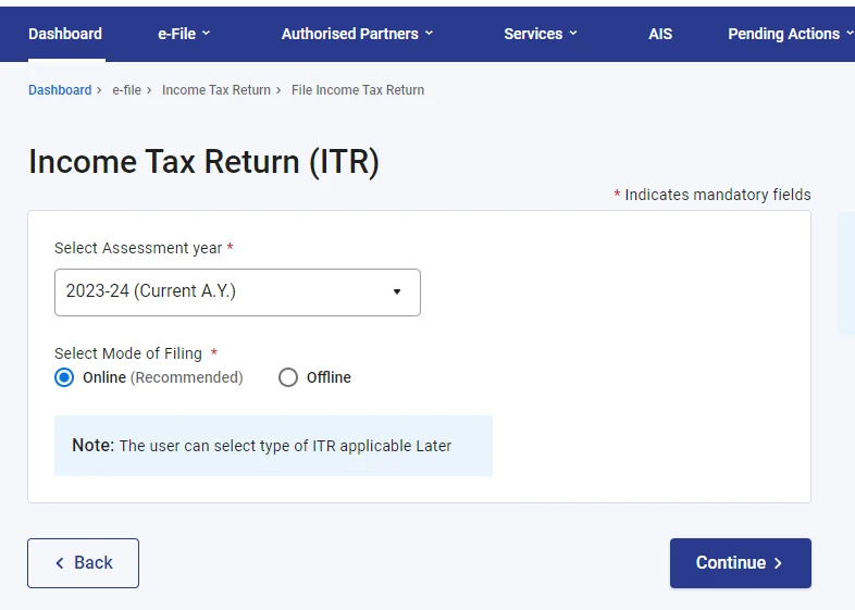 - Select the appropriate assessment year and mode of filing “Online,” then continue.