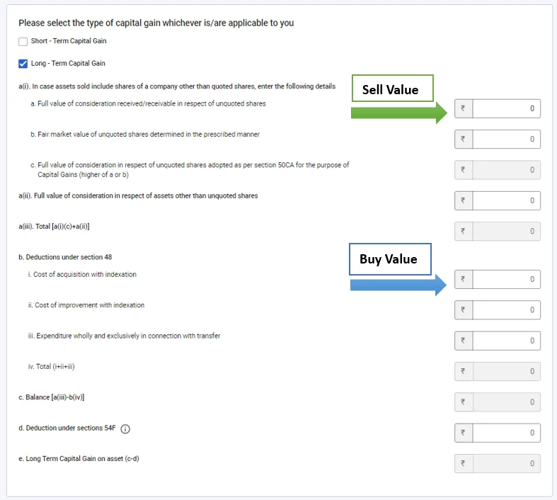 - If you have selected long-term capital gain, fill in the buy and sell value shown in the screenshot below.