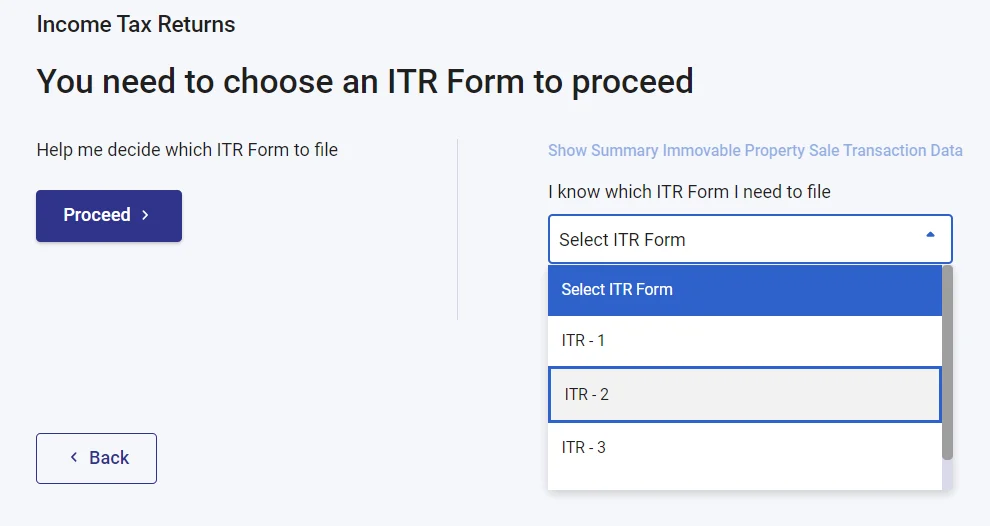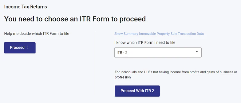 - Choose the appropriate ITR Form & proceed. I am selecting ITR-2 and proceeding.