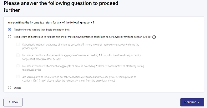 - Opt for the option applicable to you and proceed. I am selecting “Taxable income more than basic exemption” and proceeding.