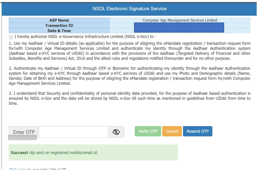 Step-10 After e-signature, the below NSDL window will appear. You need to enter your Aadhar first and submit it to get OTP. Once you enter the OTP, then WAIT for it to redirect to the CAMS website.