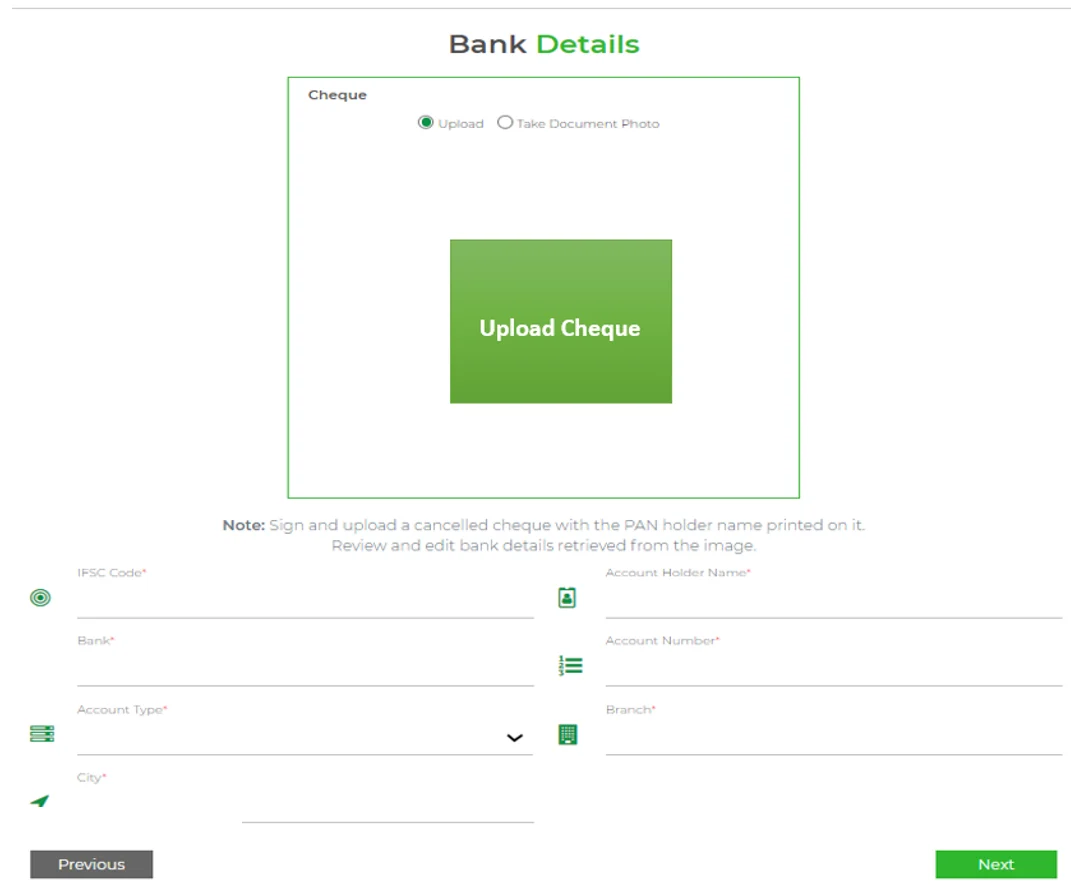Step-7 Upload the signed canceled cheque photo, and all the data will be automatically fetched. Verify the data and proceed.