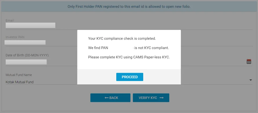 Step-3 Enter DOB as per PAN & select any one fund house- You may select Kotak MF, verify KYC, and proceed.